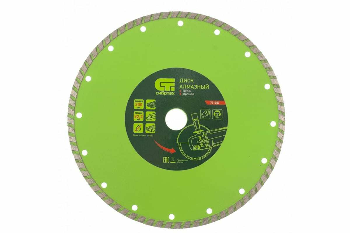 Алмазный отрезной диск Сибртех Turbo 731357 для сухой резки, 230 х 22,2 мм, устанавливается на углошлифовальные машинки и предназначен для использования в быту. Он позволяет резать твердые материалы - бетон, железобетон, камень, песчаник.