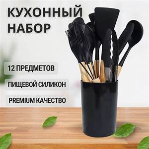 Набор кухонных принадлежностей 12 предметов LARA с круглой подставкой, черный